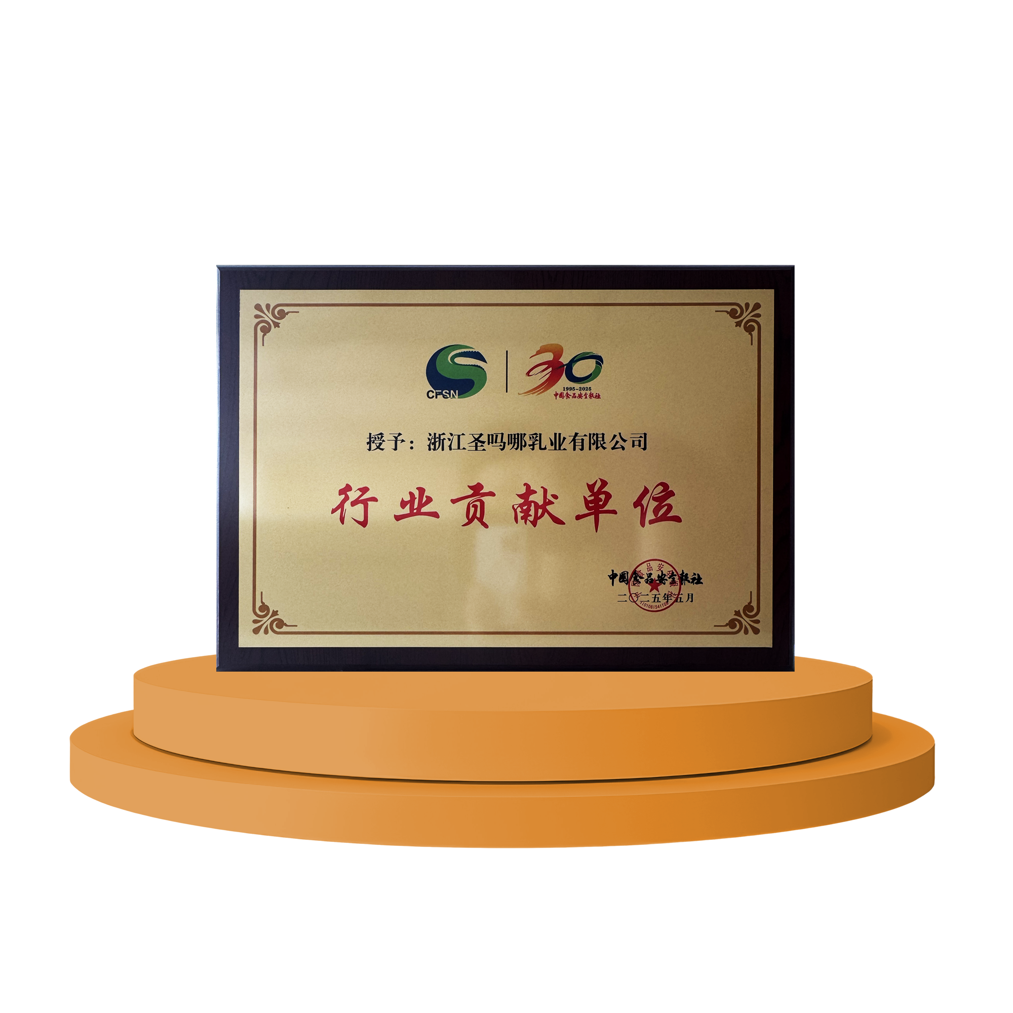 2025年5月 授予:浙江圣吗哪乳业有限公司 行业贡献单位 颁奖单位:中国食品安全报社
