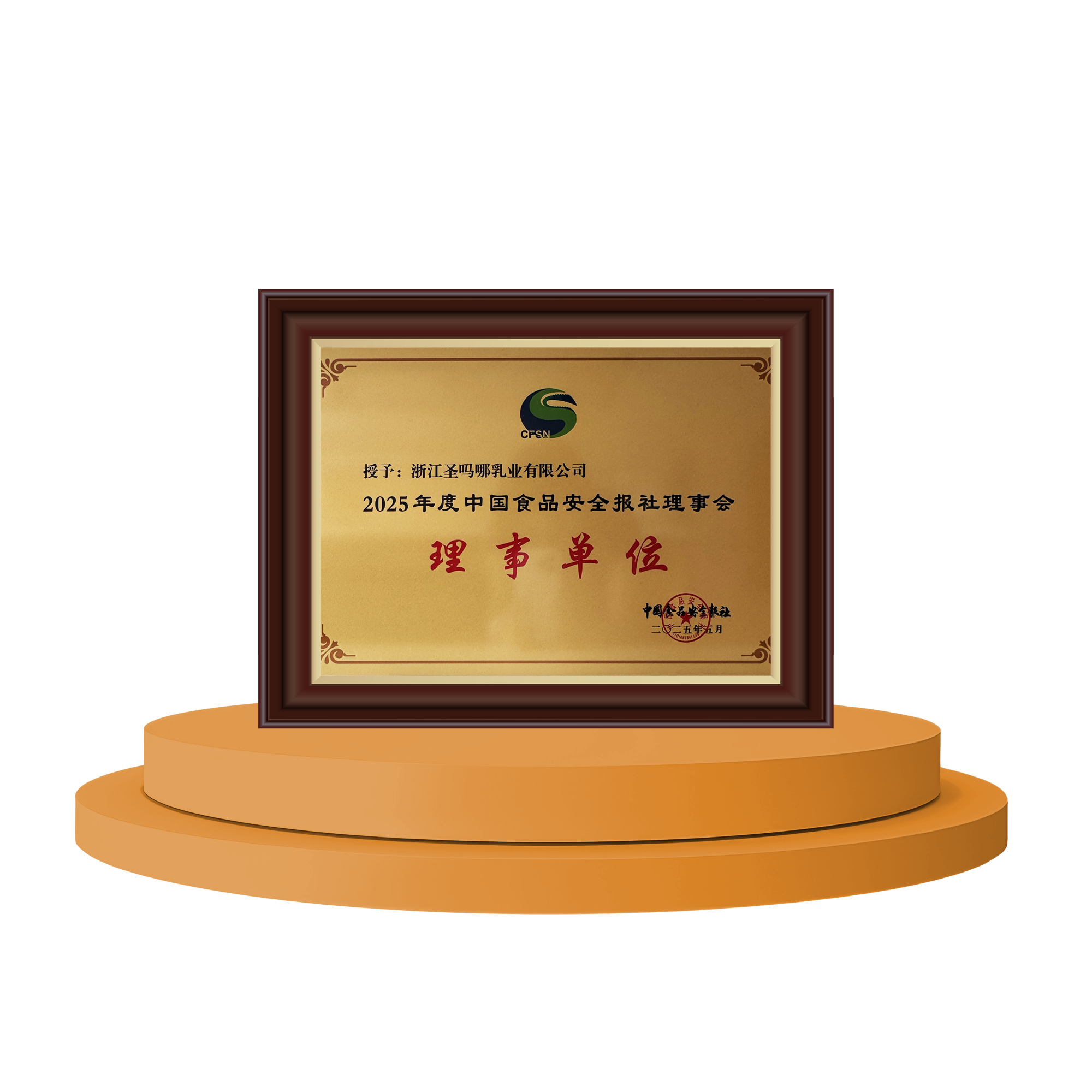 2025年5月 授予:浙江圣吗哪乳业有限公司 2025年度中国食品安全报社理事会 理事单位 颁发单位:中国食品安全报社